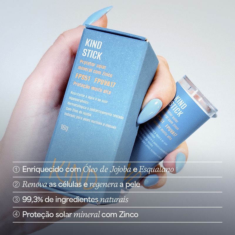 Filtro solar mineral em bastão com ingredientes de origem natural e óxido de zinco não nano. Enriquecido com óleo de jojoba, que contém ceramidas e vitaminas, e esqualano, que são ativos altamente compatíveis com a pele e oferecem hidratação equilibrada, regeneração, restabelecimento da vitalidade e protegem o microbioma cutâneo. Contém em sua formulação lecitina de soja, que promove regeneração e renovação celular. Sensorial suave, textura aveludada, não oleoso e com baixo residual branco. Fácil de aplicar, pode ser usado por toda família, especialmente em bebês e crianças. Contém 99,3% de ingredientes de origem natural ou derivado do natural. É Hipoalergênico, Dermatologicamente e Pediatricamente testado.